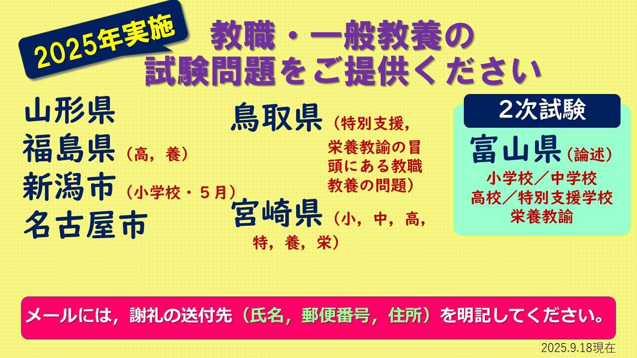 【※9/18更新】現在、以下の自治体の教職・一般教養等の試験問題を募集しております。ご協力をよろしくお願い申し上げます。