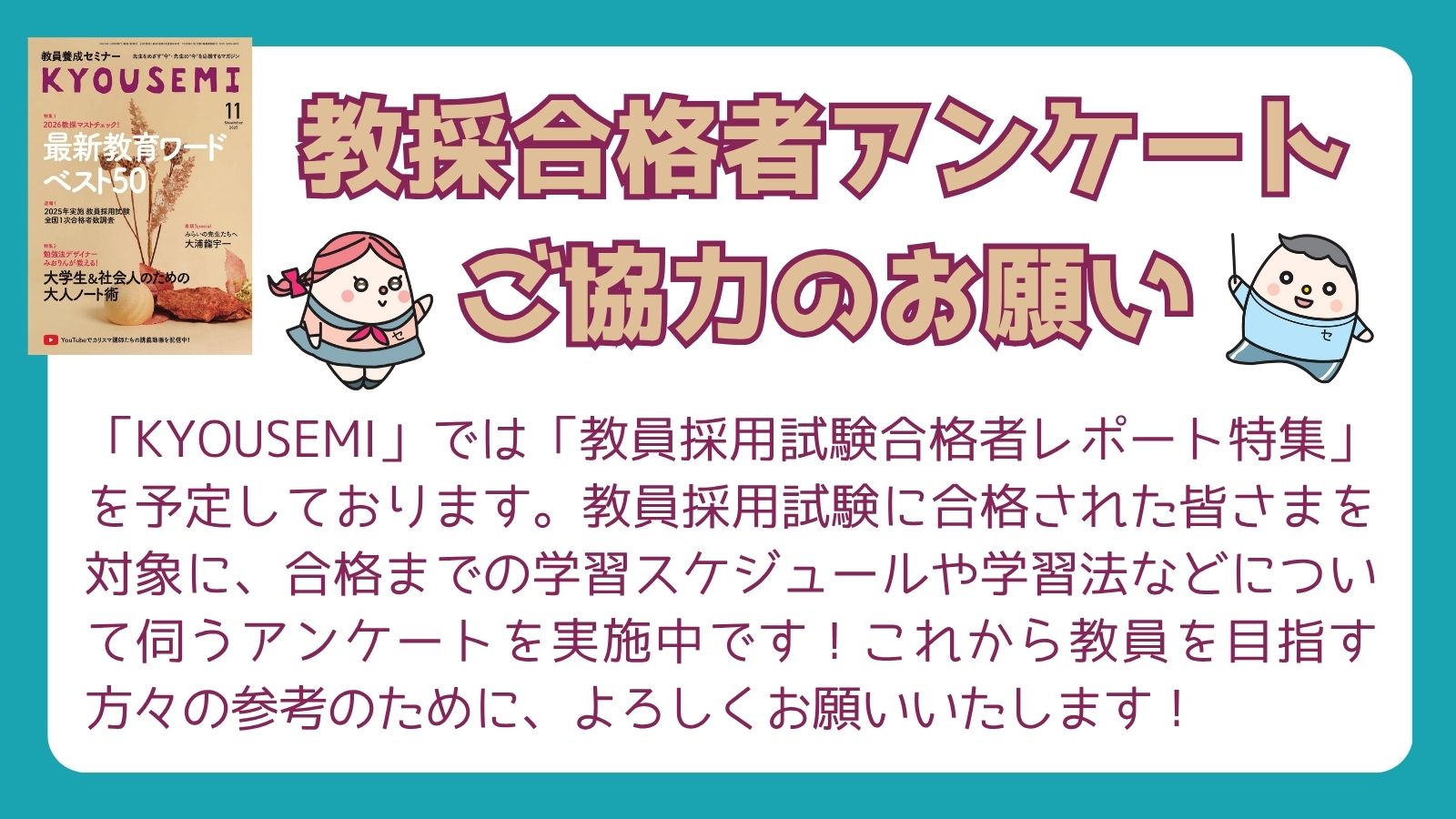 アンケートの内容は「KYOUSEMI」3月号(2026年1月22日発売予定)での教採合格者特集にて、合格者の皆さまの学習方法や体験談などの形式でご紹介させていただく予定です。