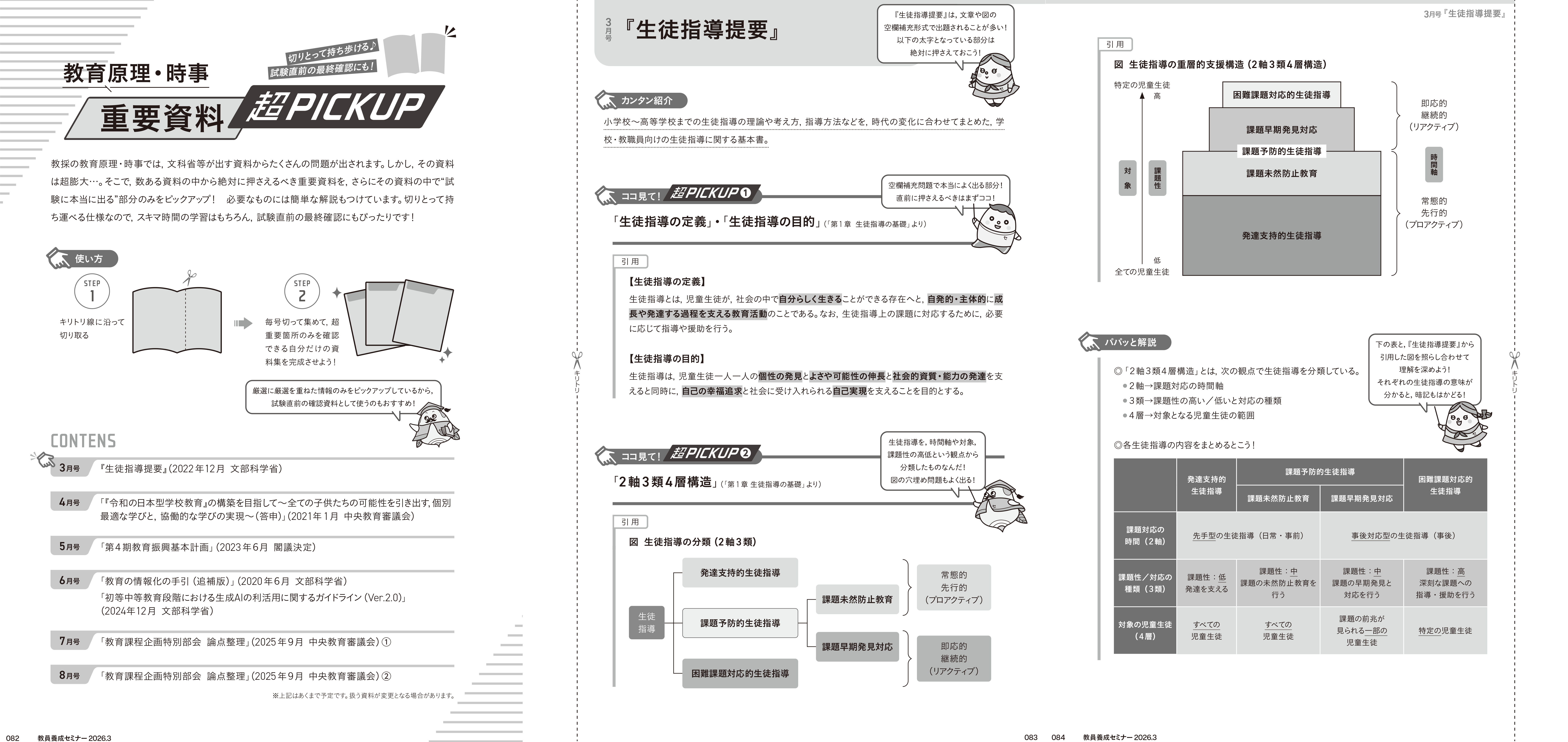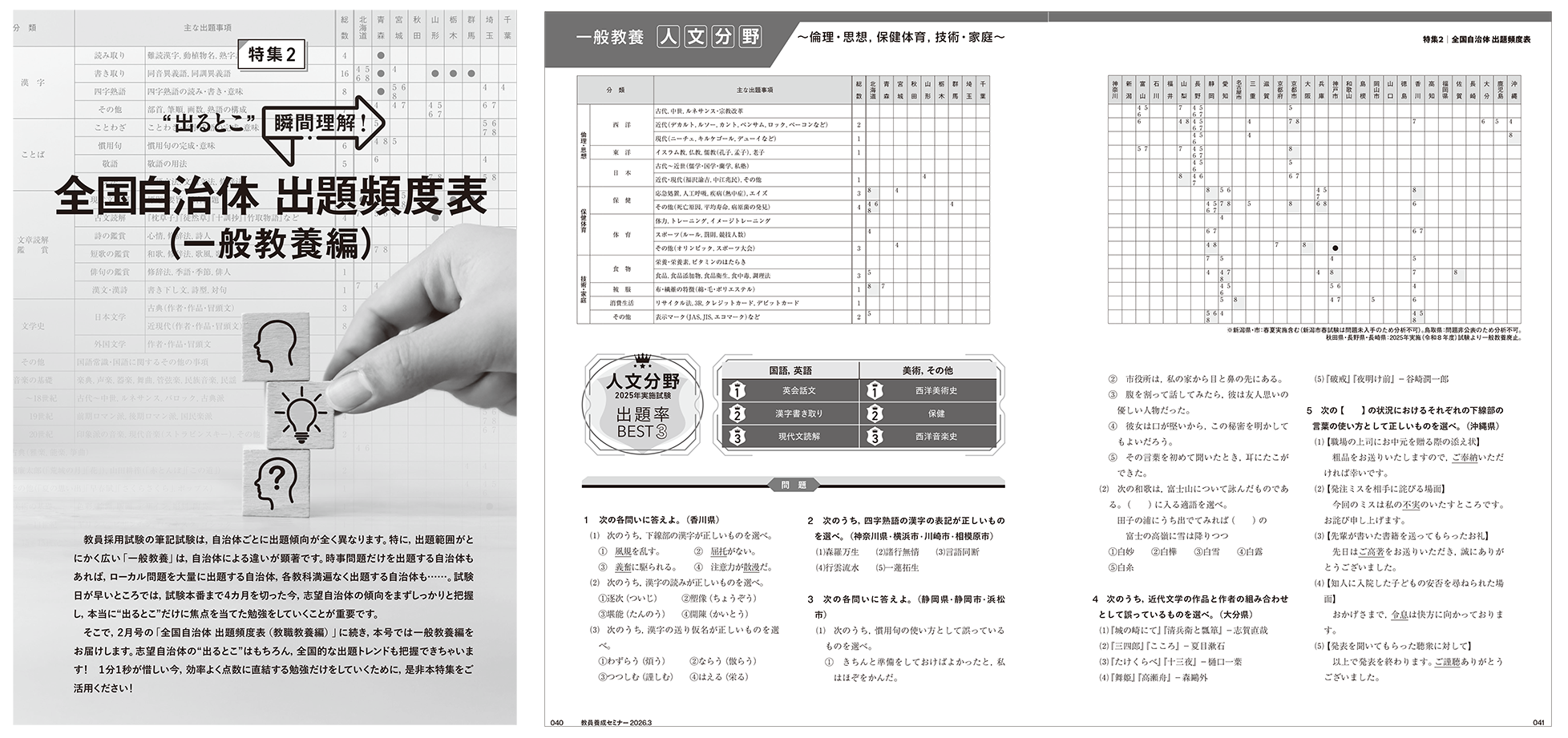 そこで、2月号の「全国自治体 出題頻度表(教職教養編)」に続き、本号では一般教養編をお届けします。志望自治体の“出るとこ”はもちろん、全国的な出題トレンドも把握できちゃいます! 1分1秒が惜しい今、効率よく点数に直結する勉強だけをしていくために、是非本特集をご活用ください!