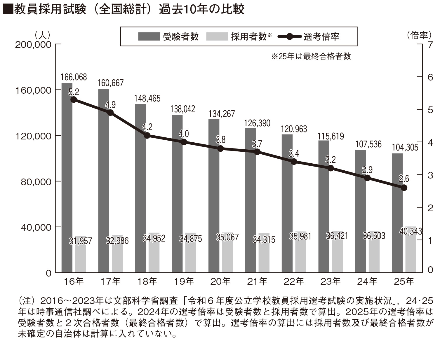 2025年実施教員採用試験は、受験者数は10万4,305人(2024年10万7,536人)、最終合格者数は4万343人(同3万6,503人)。昨年と比べて受験者数は減少しましたが、合格者数は増加しました。全国平均の選考倍率は2.6倍(同2.9倍)となり(下図参照)、昨年より減少し下降が続いています。また、3.0倍を下回った自治体は、2024年は33自治体でしたが、今年は39自治体に増えています。