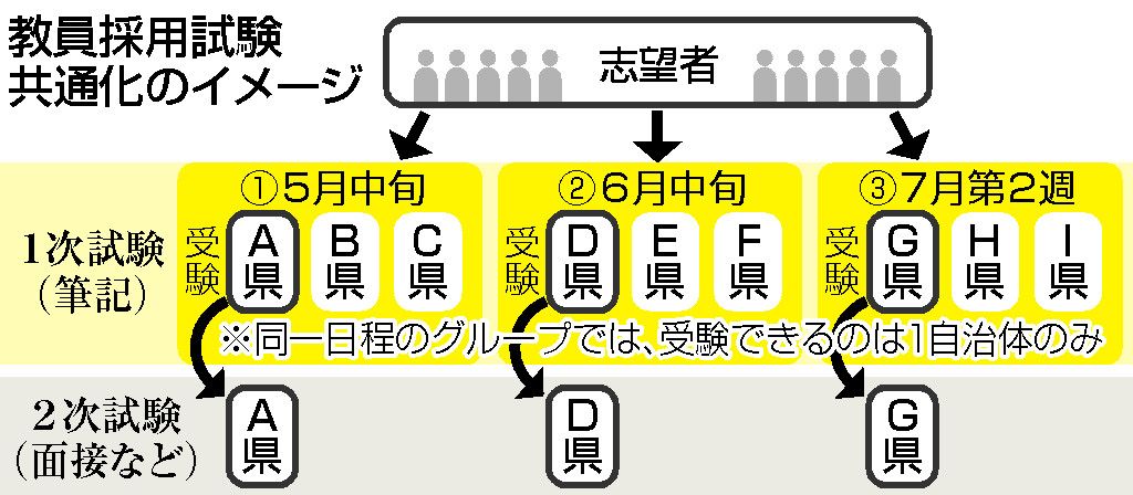 【教育ニュース】公立学校教員採用試験の1次試験(筆記)の共通化を目指している自治体協議会が、試験日を5月、6月、7月の計3回設ける方向で調整していることが分かった。試験問題を共通化して、自治体の試験作成にかかる負担を軽減する狙いがある。