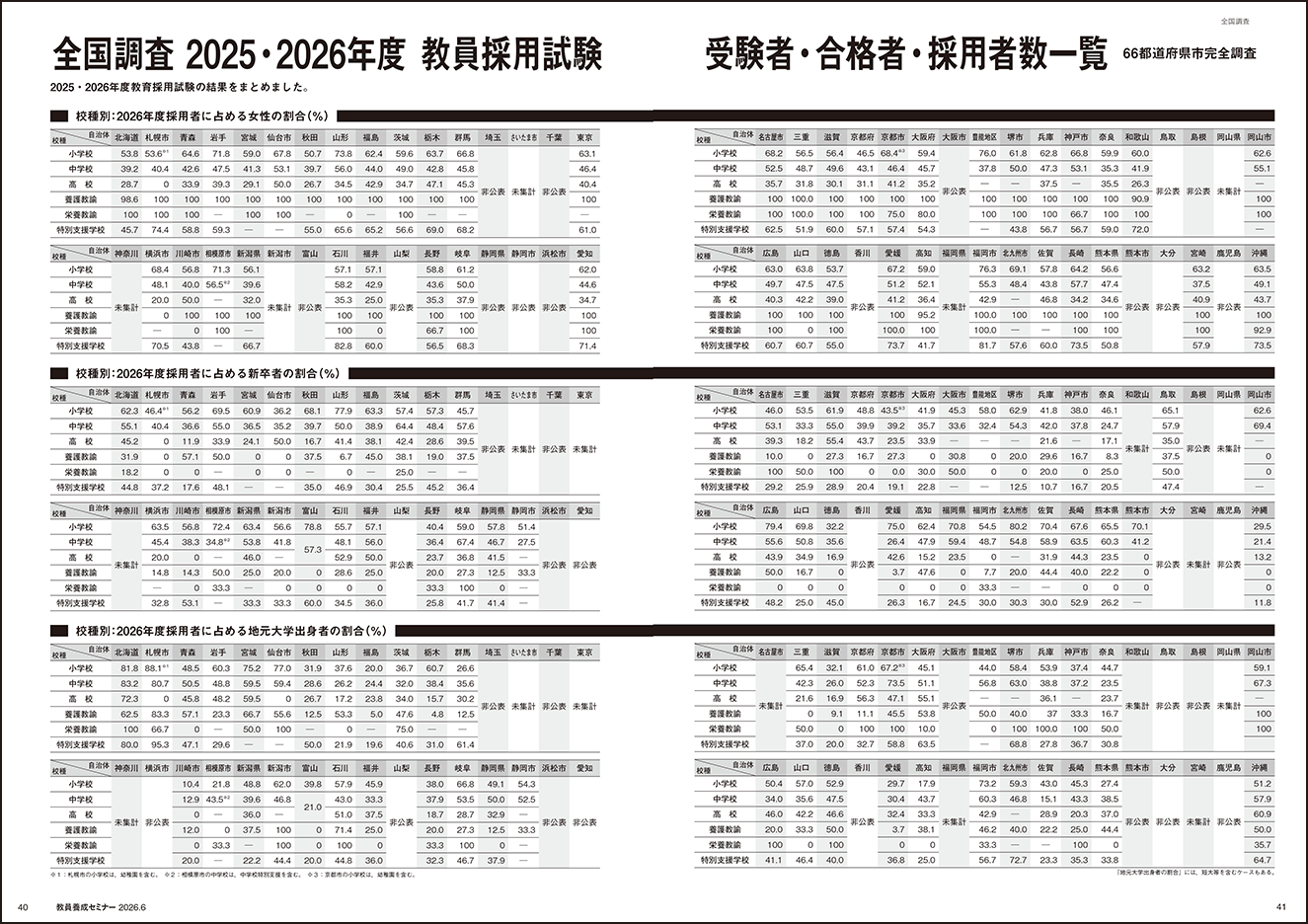 全国の自治体を対象に調査を行い、2025年・2026年度の教採受験者・合格者・採用者をまとめました。校種別の新卒者の割合、地元大学出身者などの詳細な調査結果も掲載します。受験自治体の傾向を把握するための資料としてお役立てください。